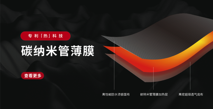JERNANO专利「热」科技——碳纳米管薄膜,具备优异的电热特性,轻薄、柔软、耐弯折、性能稳定、支持水洗,是加热技术的理想材料。据此特性,开发出了碳纳米管薄膜柔性加热系统,可广泛应用在服装穿戴、家居理疗、智能出行等领域中。