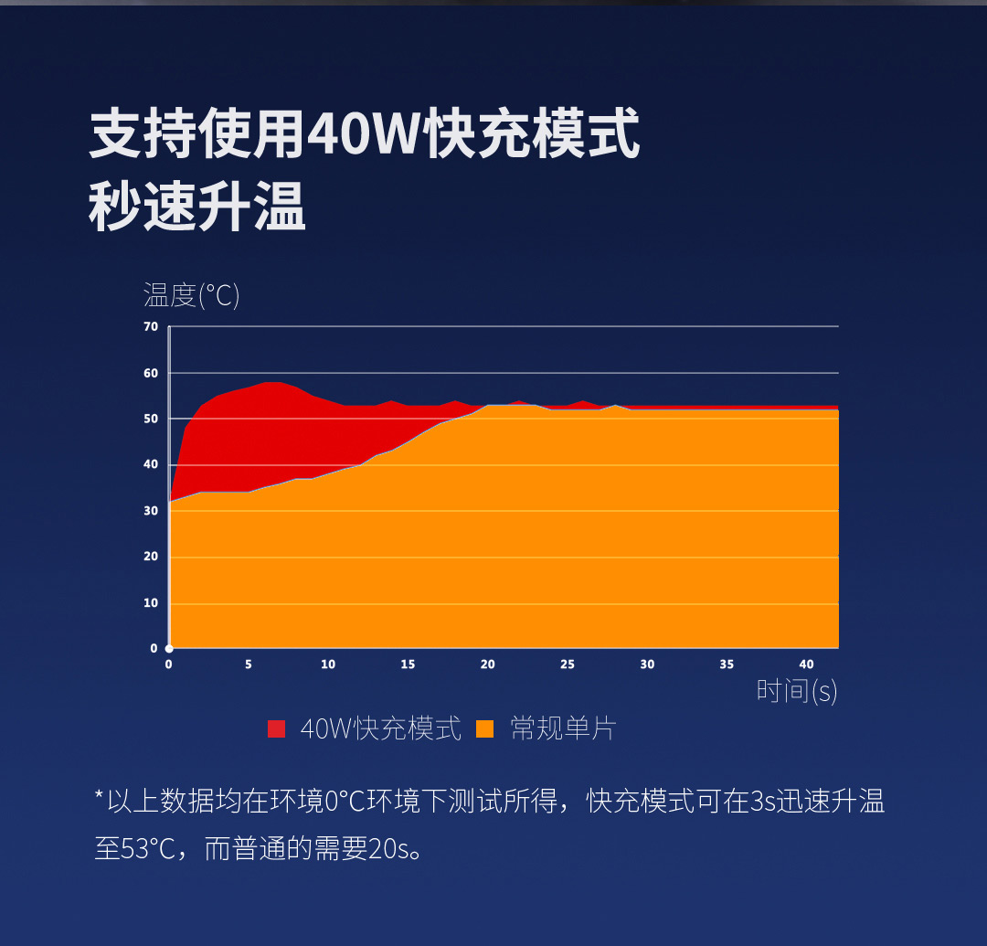 TurboHeat40W速热技术,采用中科院研发的新型碳纳米管薄膜作为发热材料,其全面兼容市面上的主流快充协议,通电后,可自动适配充电宝的类型,调用相应快充模式,仅需3S,温度就可以升至53℃,热能转化效率非常高效。加热片的面积更大,热能辐射范围更广。