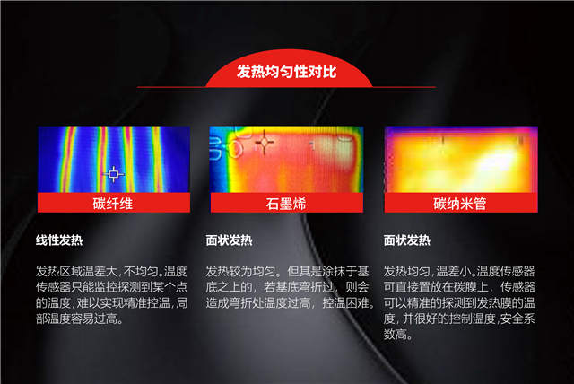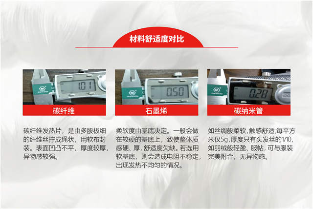 由于服装产品对水洗、弯折、舒适性,均有一定的要求,经过测试对比,碳纳米管加热材料更适合在服装穿戴领域中应用。