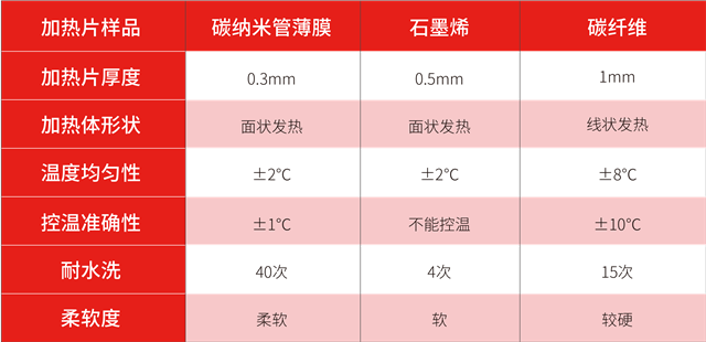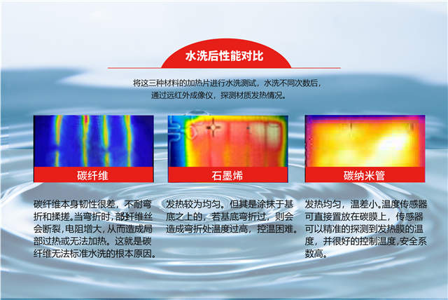 经过水洗测试数据显示:石墨烯加热片,可支持标准水洗10次左右;碳纤维加热片支持10-20次标准水洗;而碳纳米管加热片(薄膜)在标准水洗40次后,性能依旧稳定。