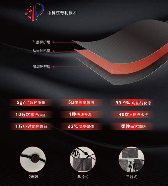 苏州公海赌船依托核心原材碳纳米管薄膜,开发出JERNANO加热组件,整机拥有超24项专利发明。其适用于各类对加热体有【柔软性】、【轻薄】、【水洗】等特性要求的产品中,如服装穿戴、家居家纺、健康理疗等领域中。